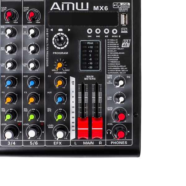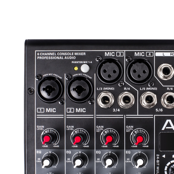A mesa AMW MX6 de segunda geração foi reformulada para trazer a você um produto de alto nível em um formato compacto. Um produto elaborado para você ter o máximo em versatilidade. É uma das poucas mesas compactas com saídas XLR balanceadas além da saída P10 padrão. Outros diferenciais são o fader duplo para controle do volume do master master, saídas control room (cópia da saída de fones) para você fazer um monitoramento separado, saída auxiliar ajustável, processador de efeitos variado com Reverb, Delay, Chorus, Flanger e display. Seu player possui função interface de áudio (para conexão com o computador), Bluetooth, função gravação, etc. É uma mesa bem completa com chassi em metal curvado e design moderno em linha com o que há de mais bonito em mesas de áudio. Um produto muito superior ao das mesas com chassi de plástico, equalizador de 2 bandas e efeito de echo que tem sido comercializadas ultimamente no Brasil.