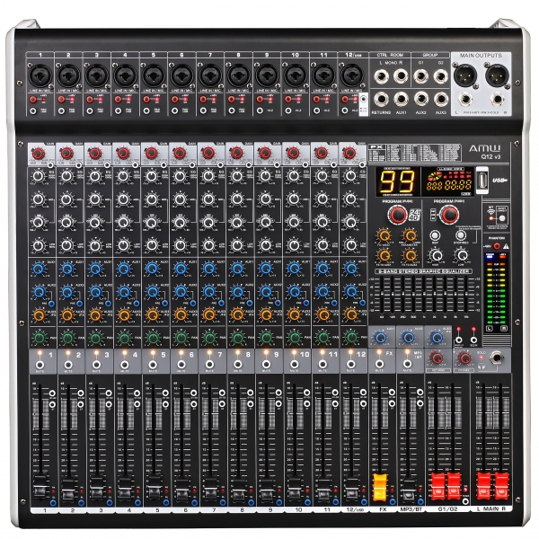 AMW Q12 v3 Mesa de Som 12 Canais Combo 99 Efx Dsp 2 Aux Hi-Z Interface USB Eq BT