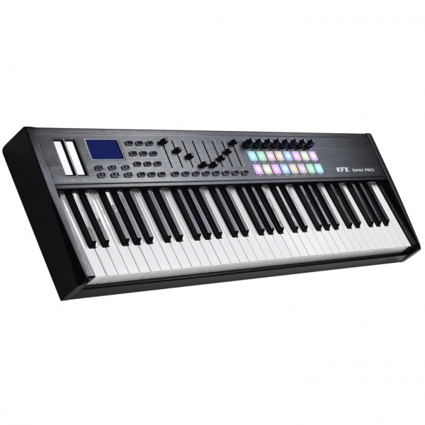 O KFX SW61 Pro acrescenta algumas funções a mais em relação ao SW61. É um produto concebido para quem busca uma extensa quantidade de controles e funcionalidades mas procura um valor um pouco mais acessível comparado a um controlador de outra marca. São 61 teclas sensíveis ao toque, 16 PADs, 8 Faders, 8 Knobs, extensa quantidade de funções extras e duas entradas para pedais (sustain e expressão). O SW61 Pro conta com 6 curvas de sensibilidade para as teclas e 6 curvas para os PADs, funções de transpose, funções de Split (Divide o teclado em duas partes), função dual (manda uma parte das teclas para canais Midi diferentes), funções de transporte para DAW (Play, pause, record, etc) e dezenas de outras funções através de 20 botões para funções/programação. É um produto que possui uma curva de aprendizado (necessidade de estudo) por se tratar de um item com extensa quantidade de funções e ajustes.